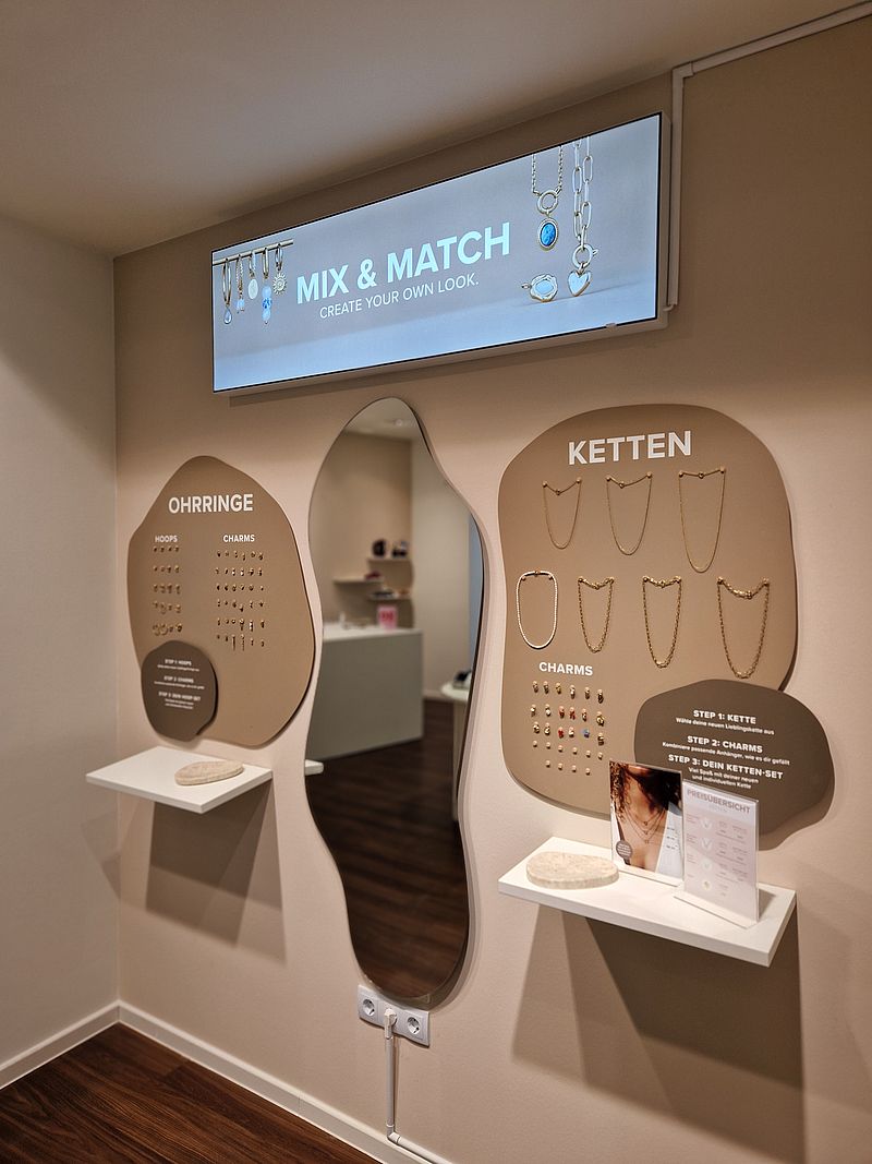 Eine Besonderheit ist die Mix & Match Ecke. Dort lassen sich mit verschiedenen Charms ganz individuelle Schmuckstücke zusammenstellen. Perfekt, um den eigenen Stil zu unterstreichen oder ein persönliches Geschenk zu gestalten.