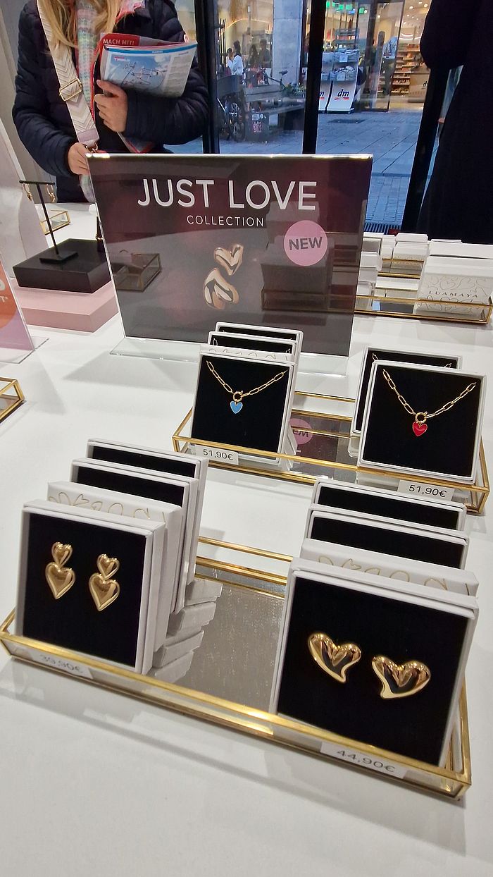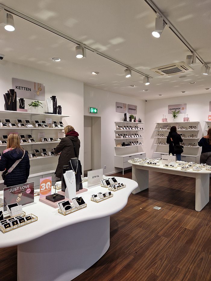 Der stilvoll eingerichtete Laden bietet eine große Auswahl an modernem Schmuck. Von Ketten und Ohrringen über Ringe und Armbänder bis hin zu trendigen Hair-Accessoires. Hier findet sich für jeden Anlass das passende Stück.