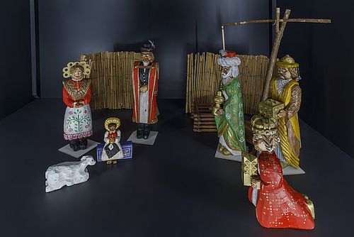 Die aus Ungarn stammende handgeschnitzte Krippe lässt ihren Ursprung eindeutig durch die Kleidung von Josef und Maria erkennen, die in den typischen farbenfrohen Trachten dargestellt sind. Der alte kniende König hat die nachgebildete ungarische Königskrone, die Stefanskrone, auf dem Kopf. Ebenso lässt der für die Pusta so typische Ziehbrunnen im Hintergrund das Herkunftsland der Krippe erahnen. Zwar wird bei einer Anbetung der Könige das Jesuskind schon etwas älter, meist auf dem Schoß der Muttergottes dargestellt. Eigenständig stehend, ebenfalls in ungarischer Tracht, ist es eine ganz eigene Bildfindung des Künstlers. Die naive Schnitzkunst aller Figuren lässt die Freude über das Ereignis auf den Betrachter überspringen.