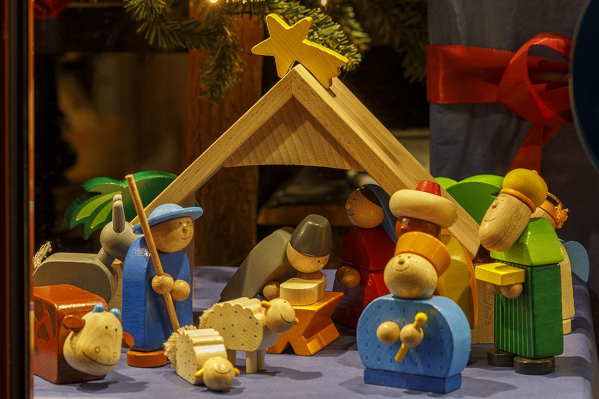 Die von der Firma HABA aus dem fränkischen Bad Rodach hergestellte Krippe besteht aus massivem Holz (wahrscheinlich Buchenholz), welches in verschiedenen Techniken bearbeitet und dann verschiedenfarbig gebeizt wurde. Mit einfachen Formen gestaltet, ist so eine naive Krippe – gemäß der Firmenphilosophie von HABA – zum Spielen für Kleinkinder entstanden. Diese Kinderkrippe besteht traditionell aus der heiligen Familie, den heiligen Drei Königen, einem Hirten mit zwei Schafen, einem Engel, Ochs und Esel sowie einem Stallgebäude mit zwei Palmen. Insgesamt eine lustige, etwas ironische Krippendarstellung, die nicht nur als Spielzeug für Kinder gedacht sein, sondern jede Krippensammlung bereichern sollte.