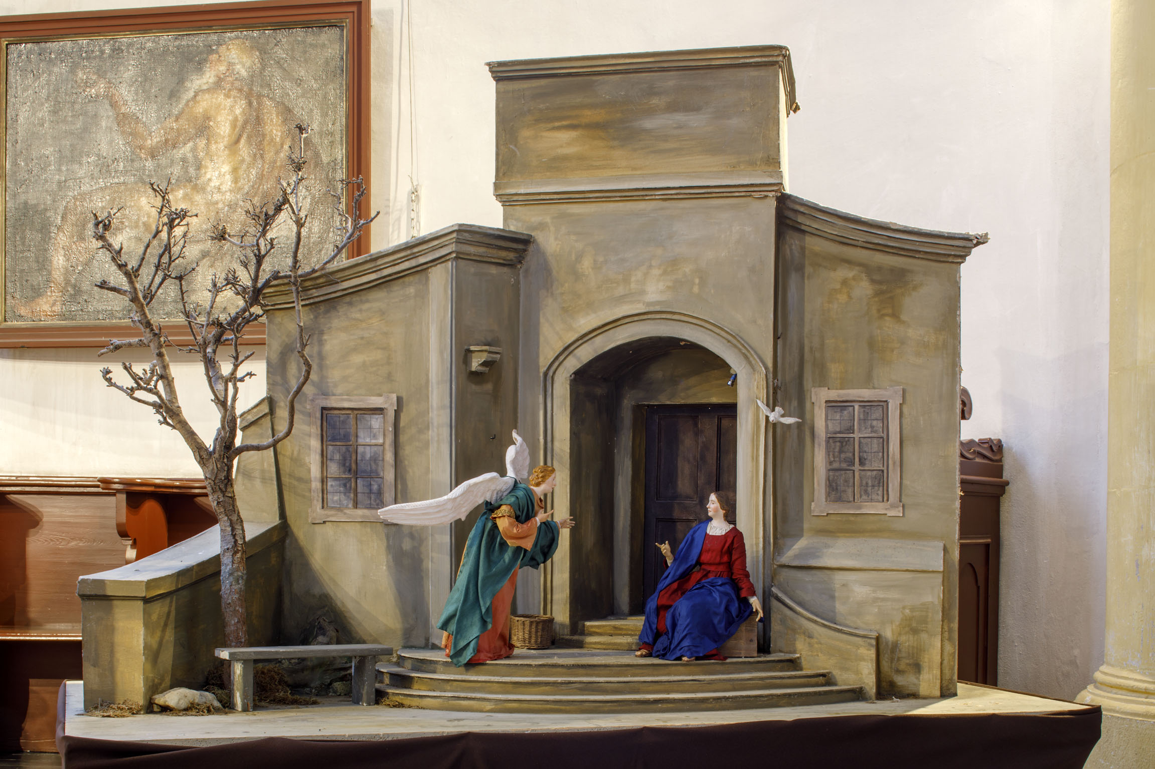 Unter der Gesamtleitung und nach einem Entwurf von Raimund Pöllmann als Gemeinschaftsarbeit von Mitgliedern des Krippenvereins Regensburg, entstand an mehreren Abenden ein Gebäude, das stimmige Kulisse für alle Szenen im Weihnachtskreis ist. Christine und Raimund Pöllmann schufen ihre bereits damals schon weit über Regensburgs Stadtgrenze hinaus bekannten 35 bis 40 cm großen Figuren.