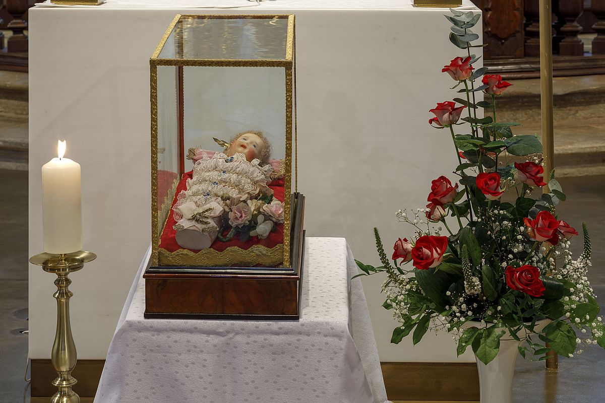 Am Volksaltar in der ältesten Bürgerkirche der Stadt lädt ein schlichter Glasschrein mit einem Fatschenkindl aus dem Jahr 1787 in der Weihnachtszeit zum Gebet ein. Ganz traditionell liegt das mit feinen Klöppelspitzen, Blüten aus Golddrähten und goldenen Bändern gefatschte Kind mit seinem fein bosierten Wachsköpfchen auf einem roten Samtkissen.