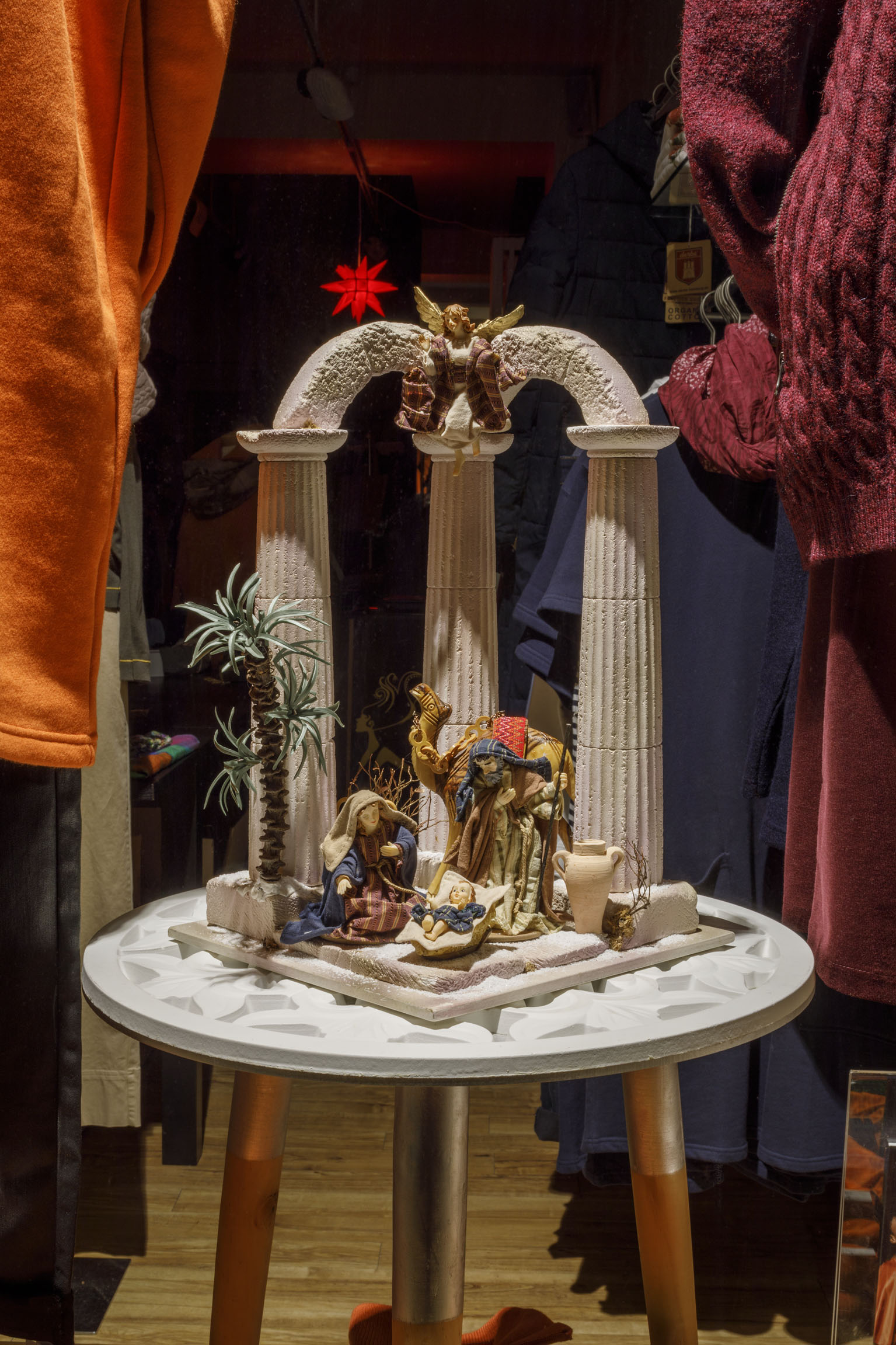 Die Krippe im Schaufenster vom Backstage zeigt die Geburt Christi mit Oberammergauer Figuren.