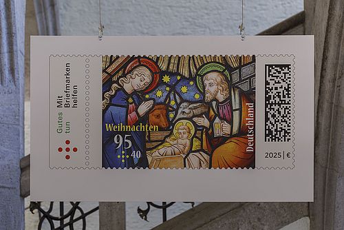 Zweimeter langes Banner zeigt die Weihnachtsbriefmarke 2025 im Treppenhaus