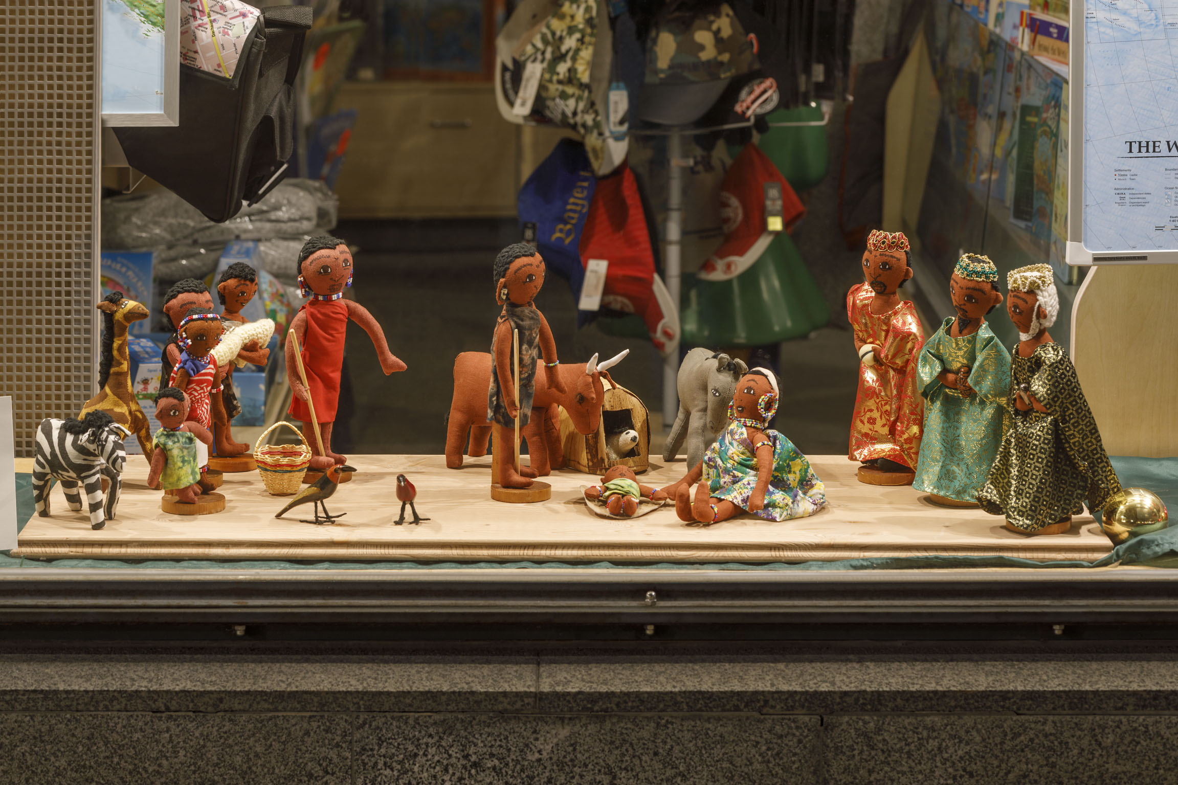 Die Krippenfiguren sind mit bunten Stoffen in kräftigen Farben bekleidet. Neben Hirten und Königen kommen auch Vögel, ein Hund, eine Giraffe und ein Zebra an die Krippe. Der Perlenschmuck ähnelt dem des Samburu-Stammes in Kenia. Die Gesichter der Figuren sind auf die dunklen Stoffe aufgemalt.