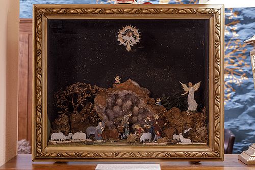 Ein Blick in diesen Kasten zeigt kleine Zinnfiguren in Kombination mit glitzernden Steinen, die eine Landschaft bilden. Die Figuren dieser „Hirten-Krippe“ wurden von Anni Schweizer in der Zinngießerei Offizin Babette Schweizer (Dießen) sehr detailliert gearbeitet und anschließend beidseitig bemalt. Den Aufbau in den Kasten und die Edelsteinlandschaft fügten Sieglinde und Udo Hergesell dazu. Je nach Lichteinfall ist im Hintergrund ein funkelnder Sternenhimmel zu sehen.