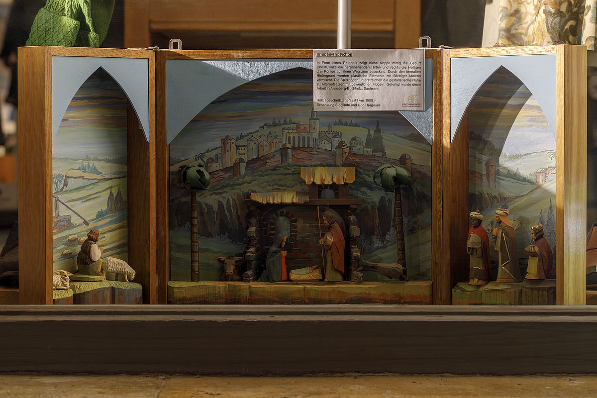 In Form eines Retabels zeigt diese Krippe mittig die Geburt Christi, links die herannahenden Hirten und rechts die Heiligen drei Könige auf ihren Weg zum Jesuskind. Durch den bemalten Hintergrund werden plastische Elemente mit flächiger Malerei vermischt. Die Spitzbögen unterstreichen die gestalterische Nähe zu Altaraufsätzen mit beweglichen Flügeln. Gefertigt wurde diese Arbeit in Annaberg-Buchholz, Sachsen.