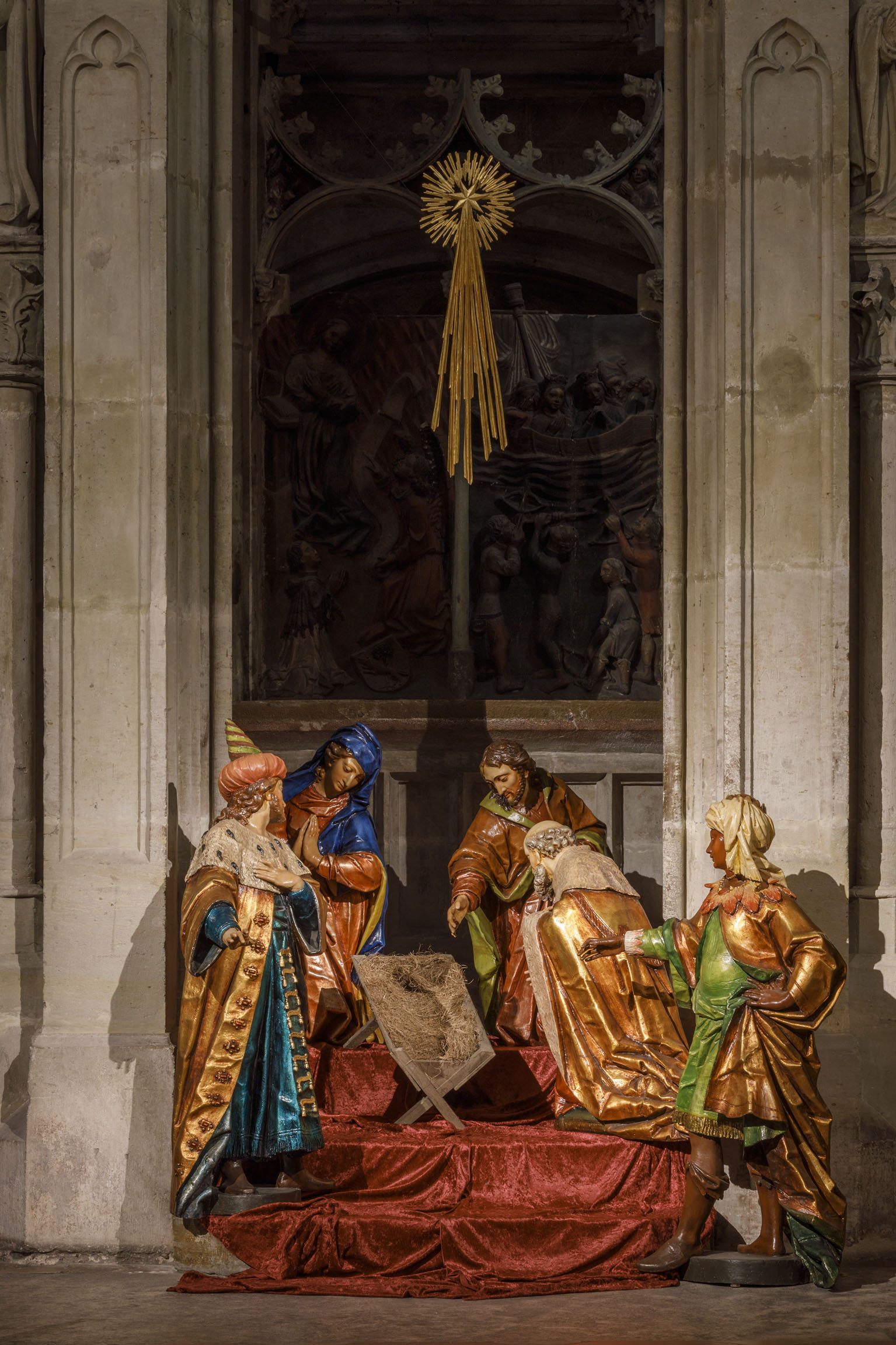 Eine spätbarocke Komposition aus Heiliger Familie und den Heiligen Drei Königen erzählt im Dom St. Peter die Weihnachtsgeschichte. Die Figuren wirken durch ihre Größe von ungefähr einem Meter sowie ihre höfisch-elegante und ausdrucksstarke Gestik. Die um 1780 vom Künstler Christoph Ittelsperger (1763-1842) geschaffenen Skulpturen mit einer Lüsterfassung des 20. Jahrhunderts stammen ursprünglich aus der im Krieg zerstörten Obermünsterkirche. Das Jesuskind wurde im 20. Jahrhundert neu geschnitzt.