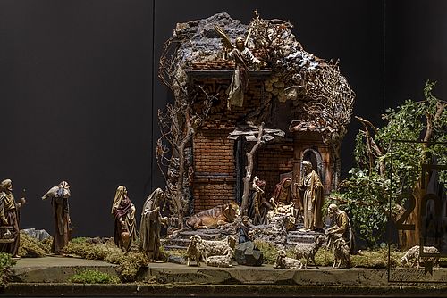 Die Immanuel-Krippe der Firma Heide aus dem Grödnertal lädt in einer vielfachen Szenerie vor einer Ruinenarchitektur zum Entdecken ein. In prächtiger orientalischer Ausstattung reiten nicht nur die Könige auf Pferd, Kamel und Elefant heran. Auch Hirten, Frauen und Schafträger sind mit kaschierter und mit Acrylfarben gefasster Kleidung aufwändig gestaltet. Die 20 cm großen Figuren wurden mit ihrer lebensechten Mimik und Haltung in Südtirol in Handarbeit gefertigt, mit großem Detailreichtum vom Sattelschmuck bis zu den Wasserkrügen.