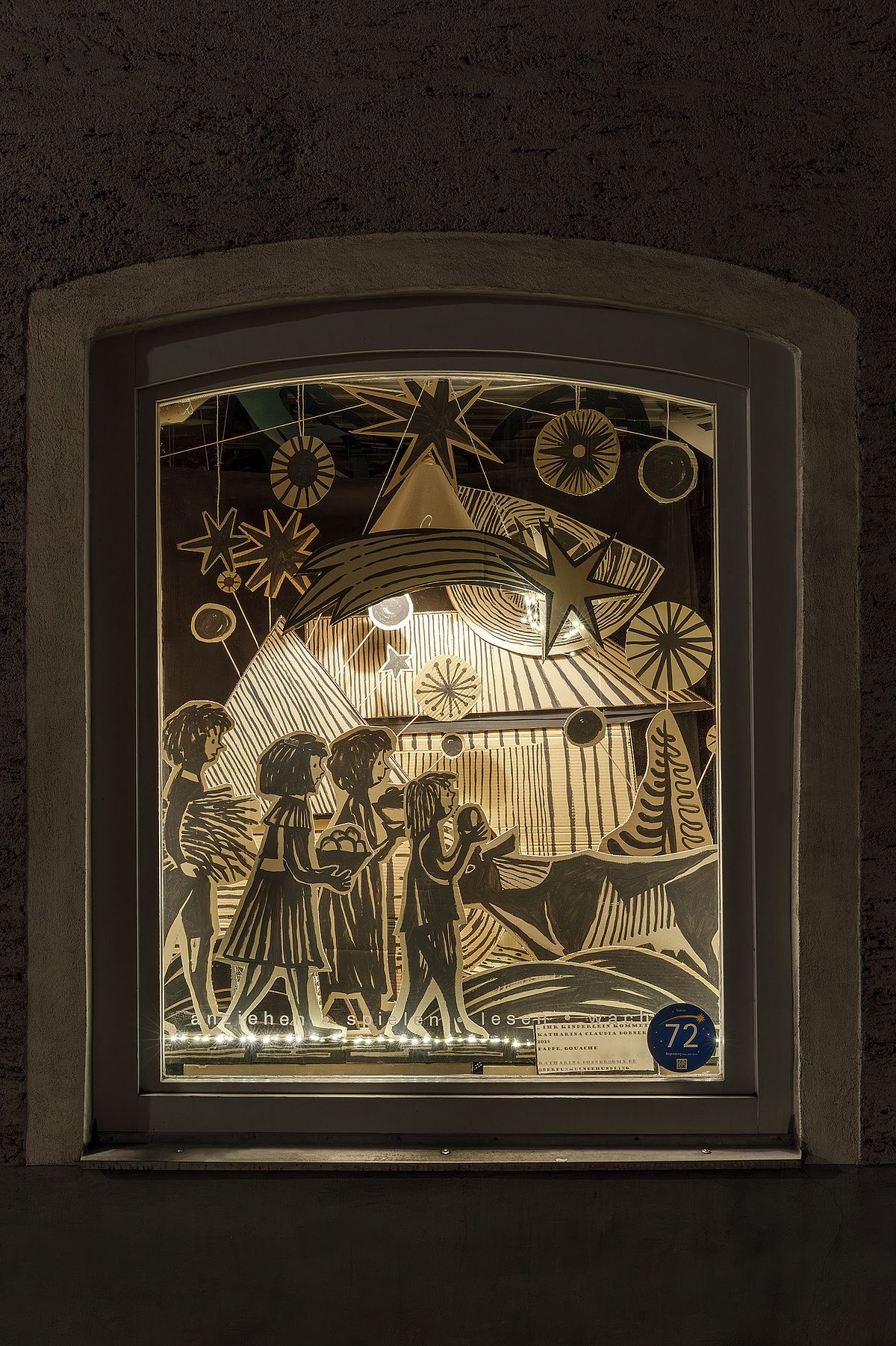 Wie ein großes Diorama, das nachhaltigerweise aus Papp- und Papierresten gefertigt und im Stile von Linoldrucken aus den 50er und 60er Jahren grafisch gestaltet ist, in Natronbraun und Schwarz gehalten ist, durch verschiedene Ebenen und beleuchtete Flächen Lebendigkeit und Tiefe bekommt und die Ankunft der Kinder bei der Krippe darstellt, soll die Vorfreude auf Weihnachten wecken und uns darauf besinnen, wie wir die Vorweihnachtszeit und die Weihnachtstage verbringen. Es ist ein Fenster zum Verweilen, Entdecken, Freuen, Lächeln und wohl fühlen, Träumen und Hoffen.